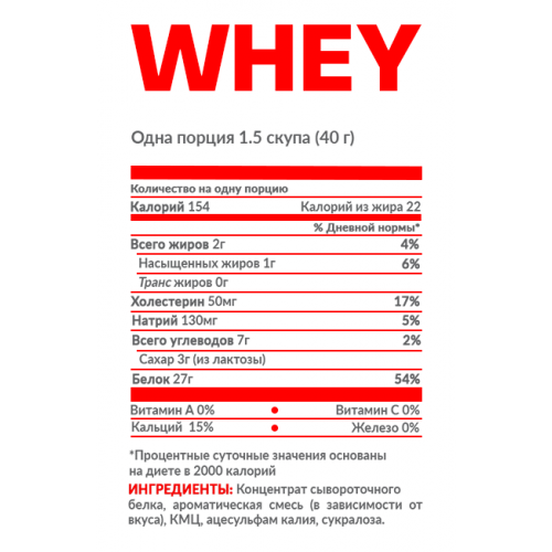 В основі продукту – концентрат сироваткового білка. Добавка виробляється методом ультрафільтрації підсирної сироватки. Протеїн виключно натуральний, не містить штучних барвників, і шкідливих домішок. Невелика кількість вуглеводів в складі є своєрідним «паливом» для протеїну, запускає і збільшує ефективність робочих властивостей білка. Містить всі необхідні для організму амінокислоти.