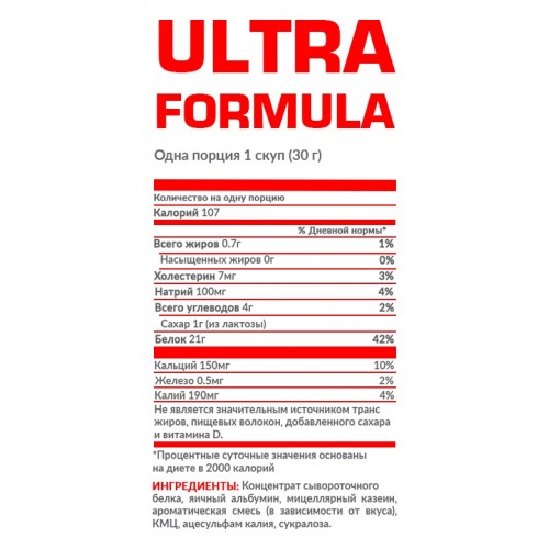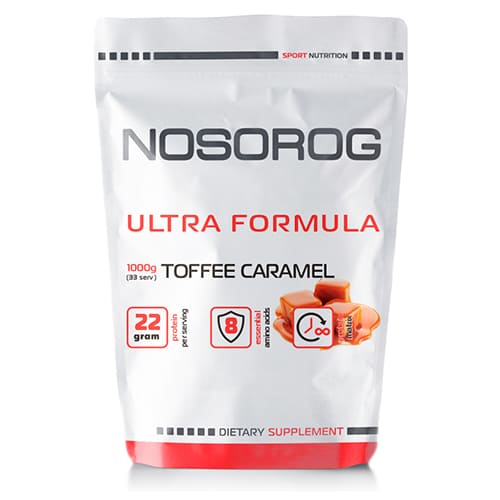 Nosorog Ultra Formula смак тофі карамель – комплекс білків 70% на основі трьох протеїнових форм (ізоляту міцелярного казеїну, концентрату сироваткового протеїну, яєчного альбуміну). Представлений продукт має ряд переваг, які вигідно відрізняють його серед аналогічною продукцією.