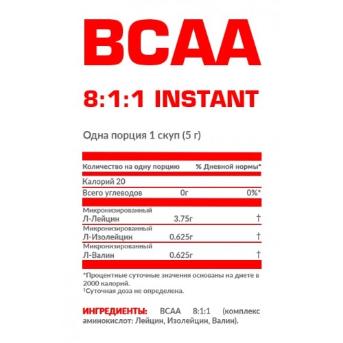 Співвідношення амінокислот 8:1:1 є досить популярним. Воно вказує на розподіл незамінних амінокислот, які входять в NOSOROG ВСАА 8:1:1 – лейцину, валіну та ізолейцину. Білки не можуть синтезуватися організмом людини, вони надходять до нас тільки ззовні: з їжею або спеціальною спортивною добавкою від NOSOROG. Якщо ви хочете швидко нарощувати якісні м’язи, тоді BCAA – це те, що потрібно.
