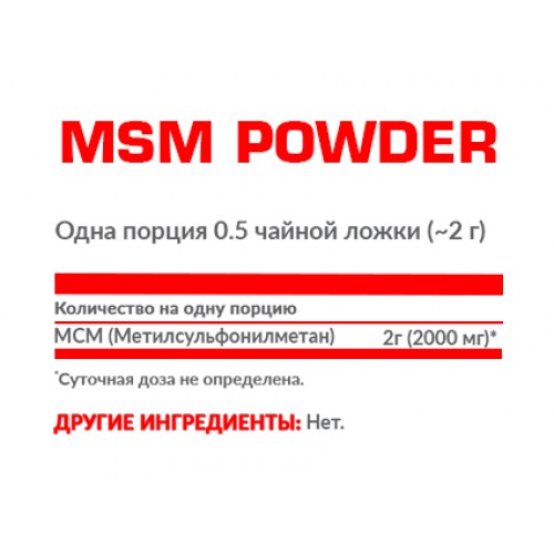 Nosorog MSM Powder 500 g (метілсульфонілметан) складається з 100% порошку MSM.