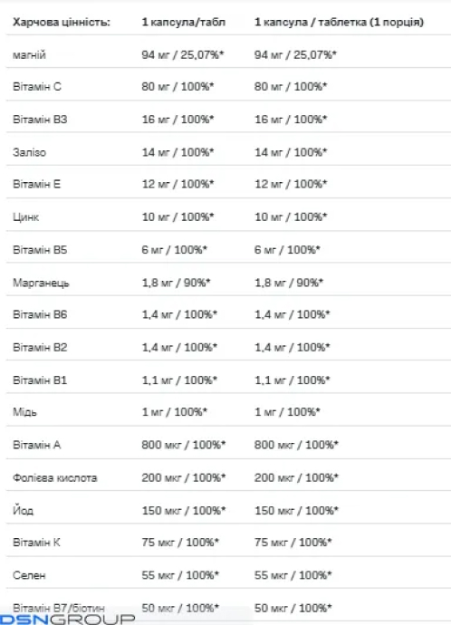 Упаковка має 20 порцій. Рекомендована порція 1 таблетка.
